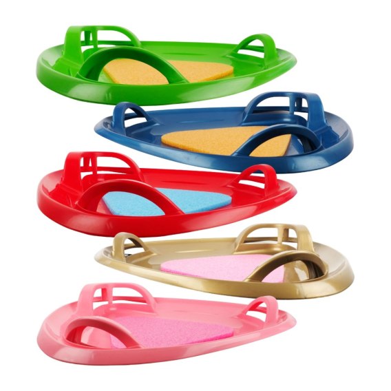 Ślizg talerz z pianką łączy bezpieczeństwo i wyjątkowe właściwości zjazdowe. Ślizg w kształcie trójkąta z trzema uchwytami: jednym większym i dwoma mniejszymi, które służą do zaparcia się w trakcie zjazdu i ułatwiają sterowanie. Wykonany z tworzywa sztucznego o odpowiedniej elastyczności. Miękka pianka do siedzenia.