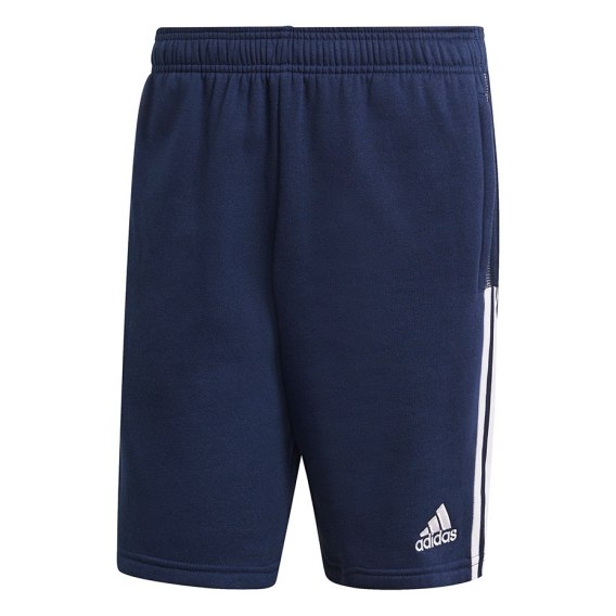 Męskie spodenki adidas Tiro 21. Model w kolorze granatowym z charakterystycznymi białymi detalami. Elastyczna talia regulowana sznurkiem, dwie boczne kieszenie zapinane na zamek błyskawiczny. Miękki, polarowy materiał.